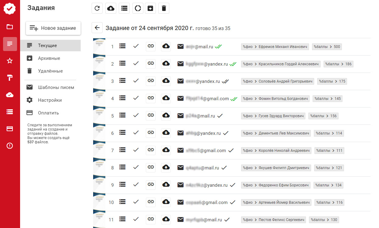 Если вы проводите олимпиады, конкурсы, обучающие курсы и вам нужно регулярно создавать множество дипломов или сертификатов с одинаковым шаблоном, но с разными персональными данными, то воспользуйтесь специальными возможностями по созданию и получению документов!
