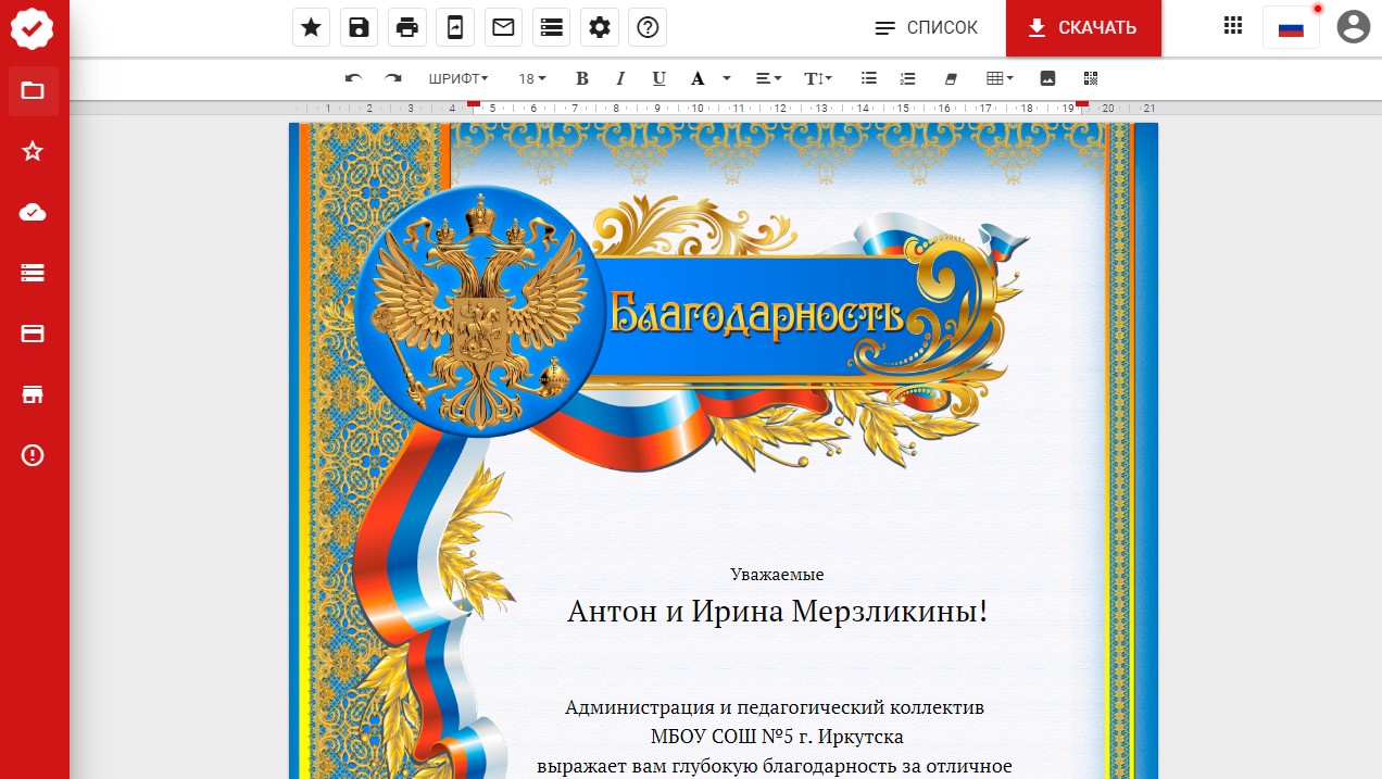 Итак, в этой статье мы раскрыли как за несколько минут можно создать благодарности родителям ученика на весь класс. Инструмент “Список” - это действительно находка для учителей! Ведь с его помощью можно создавать не только такие благодарности. Он может пригодится при вручении грамот и дипломов. Вы можете использовать метки %заслуга, %класс, %место и так далее, чтобы достичь своей цели. Инструмент никак не ограничен.
