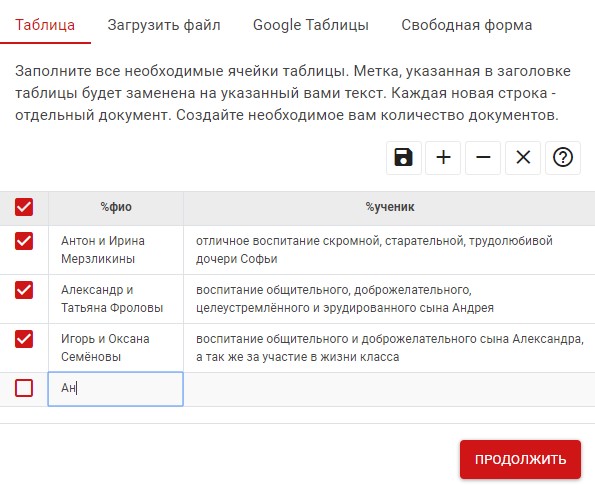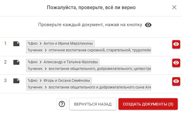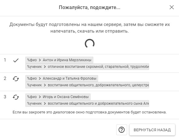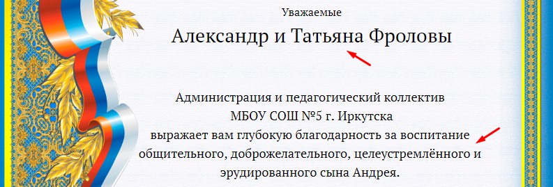 Итак, у нас две метки %фио и %имя. И в эти места редактор подставит наши имена родителей и учеников по списку, сэкономив нам время.