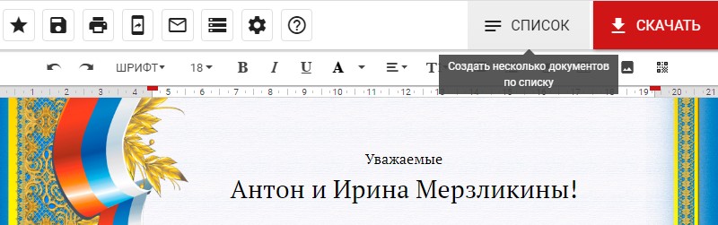 Теперь, когда написан основной текст, обращение, а так же за какие заслуги можно сохранять или печатать документ. Но, если необходимо создать таких файлов 20 штук, да каждый со своими данными, эта задача из простой превращается в сложную. Благо в редакторе ГрамотаДел есть специальный инструмент создания файлов по списку. Он находится на панели инструментов, рядом с кнопкой "Скачать".