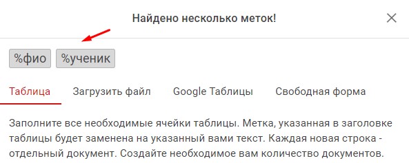 В открывшемся окне видно, что редактор нашёл две метки - %фио и %ученик. Значит мы написали всё верно. Если редактор находит не все ваши метки, либо появляется что то лишнее - нужно проверить, всё ли верно написано.