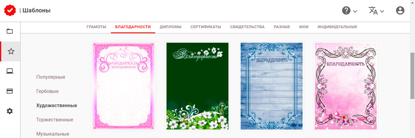 Для начала откроем шаблоны благодарностей. Нам подойдут торжественные или школьные.