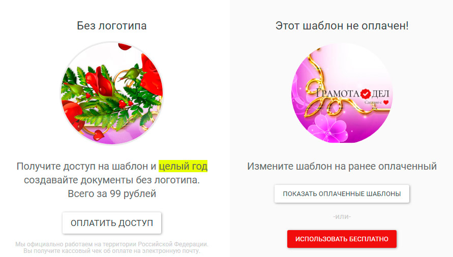 В ГрамотаДеле можно создать благодарность учителю бесплатно. Но при этом на готовом документе будет небольшой логотип внизу. Если это не подходит, можно оплатить лицензию на один шаблон или на пакет всех шаблонов. Лицензия на один шаблон стоит 99 руб на год. На все шаблоны - от 167 руб в месяц. В любом случае, в редакторе нет никаких ограничений на количество готовых документов. Как использовать ГрамотаДел - платно или бесплатно - решать вам!