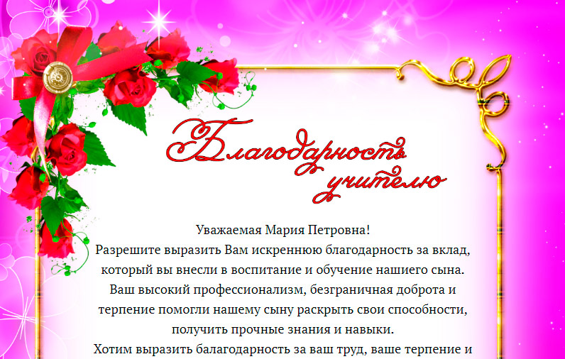 Нужно написать текст. Можно самостоятельно облечь свою благодарность в слова, либо воспользоваться поиском в Google или Яндексе по запросу “благодарность учителю текст”. Но мы, всё же, рекомендуем написать свой текст.