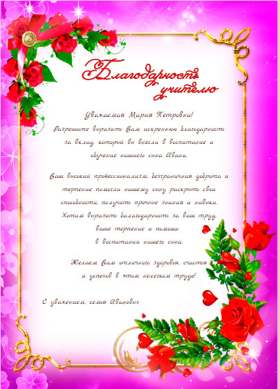 В заключении ещё раз нужно посмотреть на весь документ. Хорошо ли он смотрится? Стоит ли изменить шрифт, его размер, или межстрочный интервал? Нет ли орфографических и пунктуационных ошибок (было бы некрасиво вручать благодарность учителю с ошибками).