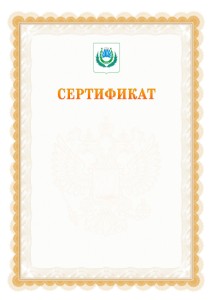 Сертификат выполнен в официальном стиле. В заголовке размещен герб Нальчика, украшеный золотыми ветками. Фон шаблона - светло-синий с гильоширной сеткой, оформлен фигурной синей рамкой. Шаблон сертификата подходит для любых официальных событий и мероприятий Нальчика. и может использоваться администрациями и другими органами власти, школами и детскими садами Нальчика.