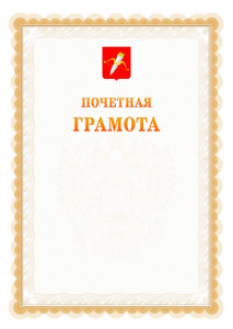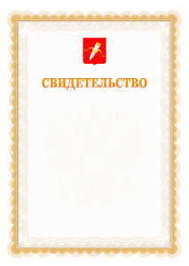 Сертификат с гербом Ачинска оформлен красивой гильоширной рамкой бежевого и жёлтого цветов. На фоне - герб Российской Федерации. Сертификат предназначен для использования организациями Ачинска - администрациями, школами, детскими садами и другими учереждениями. В заголовке сертификата - герб Ачинска. Вы можете скачать бесплатно шаблон сертификата, заполнив его предварительно в онлайн-редакторе.