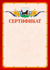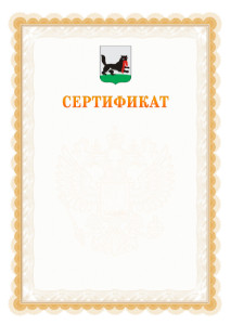 Сертификат с гербом Иркутска и флагом Российской Федерации в виде двусторонней ленты, украшенные золотыми веточками. Основной фон сертификата - светлый, однотонный, оформленный изящной золотистой рамкой с кленовыми листьями и окантовкой темно-синего цвета. Скачайте этот шаблон с гербом Иркутска с нашего онлайн конструктора сертификатов.