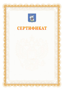 Сертификат выполнен в официальном стиле. В заголовке размещен герб Калининграда, украшеный золотыми ветками. Фон шаблона - светло-синий с гильоширной сеткой, оформлен фигурной синей рамкой. Шаблон сертификата подходит для любых официальных событий и мероприятий Калининграда. и может использоваться администрациями и другими органами власти, школами и детскими садами Калининграда.