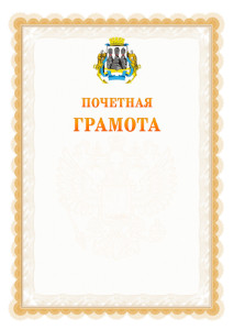 Сертификат с гербом Петропавловск-Камчатского оформлен красивой гильоширной рамкой бежевого и жёлтого цветов. На фоне - герб Российской Федерации. Сертификат предназначен для использования организациями Петропавловск-Камчатского - администрациями, школами, детскими садами и другими учереждениями. В заголовке сертификата - герб Петропавловск-Камчатского. Вы можете скачать бесплатно шаблон сертификата, заполнив его предварительно в онлайн-редакторе.
