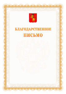 Почётная грамота с гербом Владимира оформлена красивой гильоширной рамкой бежевого и жёлтого цветов. На фоне - герб Российской Федерации. Грамота предназначена для использования организациями Владимира - администрациями, школами, детскими садами и другими учереждениями. В заголовке почётной грамоты - герб Владимира. Вы можете скачать бесплатно шаблон почётной грамоты, заполнив его предварительно в онлайн-редакторе.