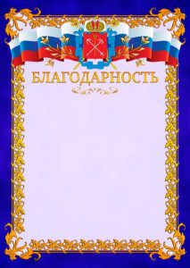 Грамота с гербом Санкт-Петербурга и флагом Российской Федерации в виде двусторонней ленты, украшенные золотыми веточками. Основной фон грамоты - светлый, однотонный. Шаблон оформлен изящной золотистой рамкой с кленовыми листьями и окантовкой темно-синего цвета. Шаблон грамоты с гербом Санкт-Петербурга можно использовать для награждения на различных региональных событиях и мероприятиях. Скачайте этот шаблон с гербом Санкт-Петербурга с нашего онлайн конструктора грамот.