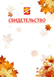 Свидетельство с гербом Орехово-Зуево и флагом Российской Федерации в виде двусторонней ленты, украшенные золотыми веточками. Основной фон свидетельства - светлый, однотонный. Шаблон оформлен изящной золотистой рамкой с кленовыми листьями и окантовкой темно-синего цвета. Скачайте этот шаблон с гербом Орехово-Зуево с нашего онлайн конструктора свидетельств.